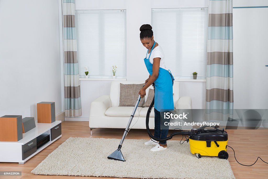 Young African Woman Cleaning Carpet With Vacuum Cleaner